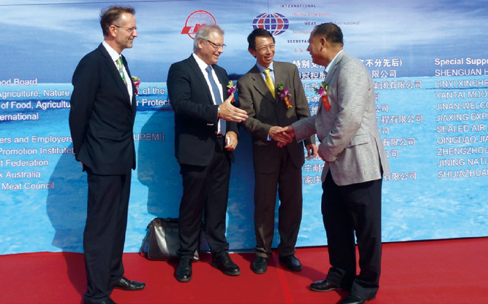 2013年10月13日,第十一屆中國(青島)國際肉類工業(yè)展覽會上,大莊園集團董事長陳希濱與世界肉類組織主席阿圖羅·拉瓦洛友好交談。