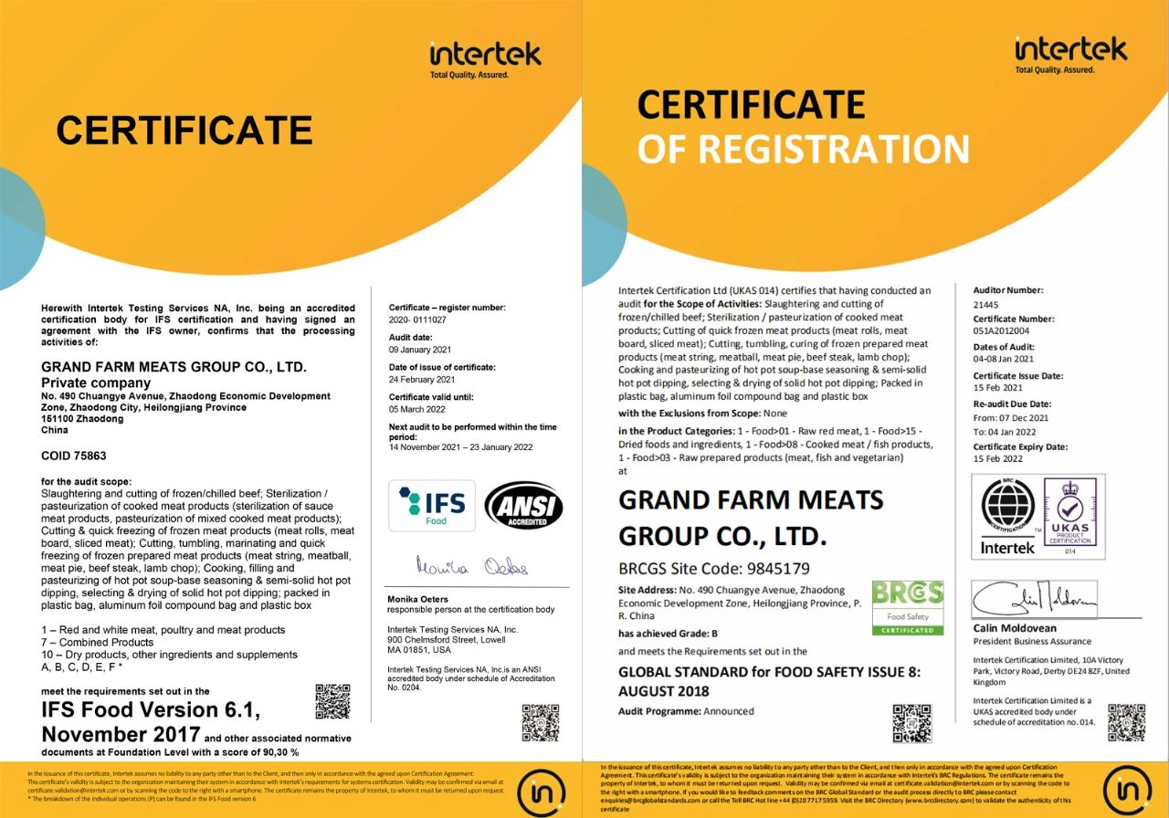 2021年2月25日,大莊園順利通過BRCGS(食品安全全球標(biāo)準(zhǔn))、IFS(國際食品標(biāo)準(zhǔn))兩大國際食品標(biāo)準(zhǔn)認(rèn)證,成為國內(nèi)畜類及牛羊肉行業(yè)第一家通過歐洲國際雙體系質(zhì)量認(rèn)證的企業(yè)。