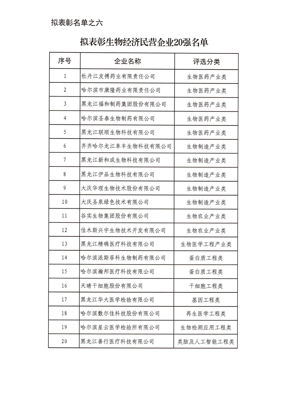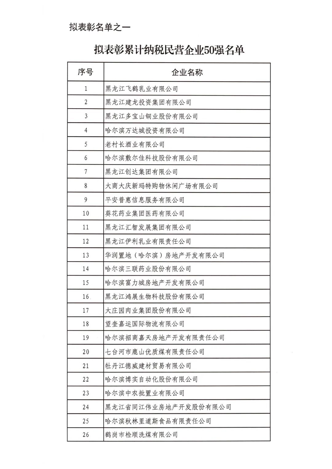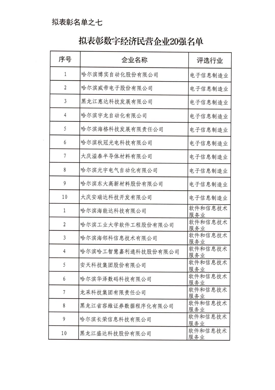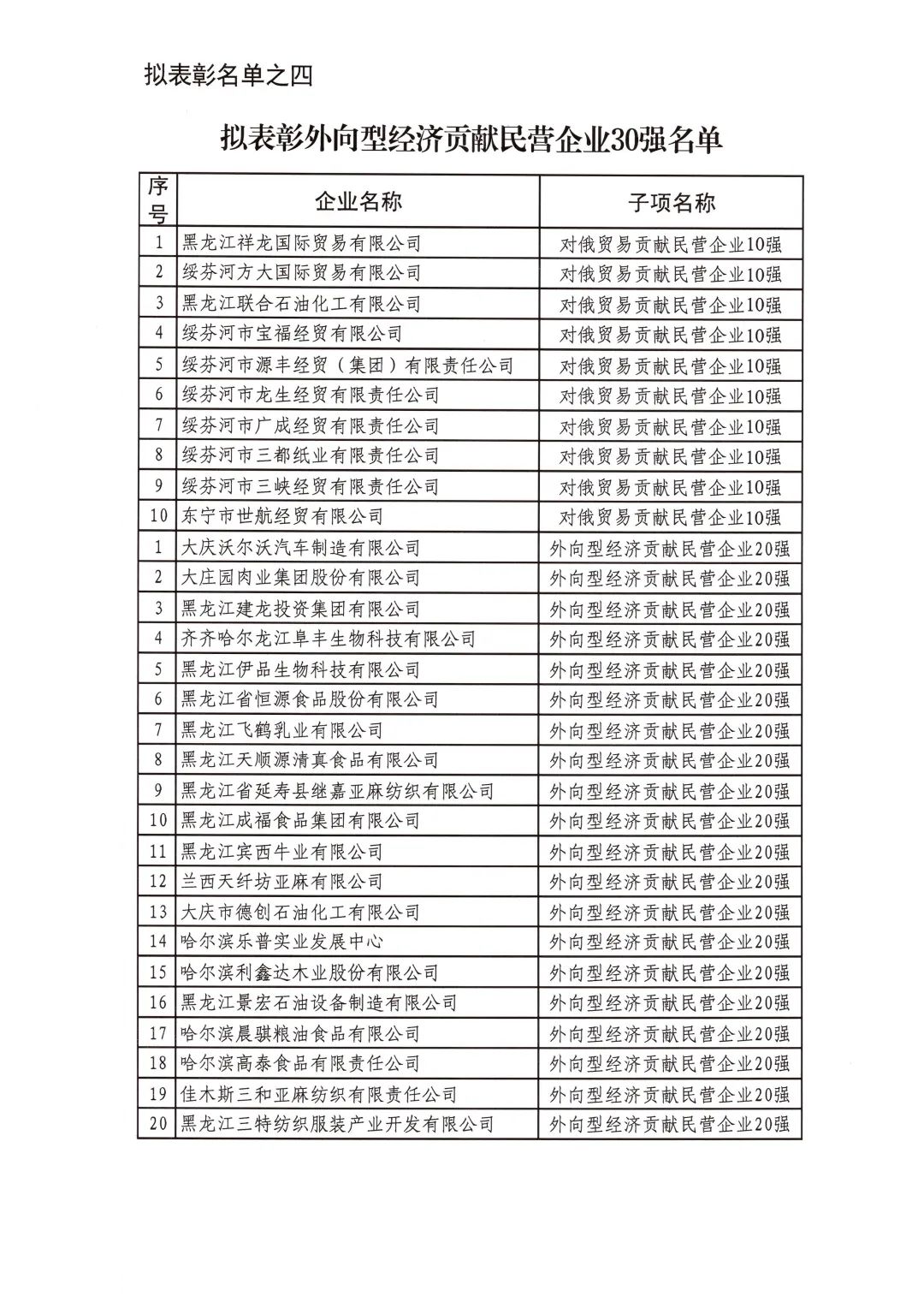 按照省委省政府關(guān)于召開全省民營經(jīng)濟大會的決策部署要求,擬對全省優(yōu)秀民營企業(yè)進行表彰。經(jīng)企業(yè)自愿申報、市(地)把關(guān)推薦,評審小組排名,征求相關(guān)部門意見等程序,擬表彰全省累計納稅民營企業(yè)50戶、就業(yè)突出貢獻民營企業(yè)20戶、民營高新技術(shù)企業(yè)50戶、外向型經(jīng)濟貢獻民營企業(yè)30戶、龍江質(zhì)量品牌優(yōu)秀民營企業(yè)50戶、生物經(jīng)濟民營企業(yè)20戶和數(shù)字經(jīng)濟民營企業(yè)20戶?,F(xiàn)將擬表彰名單予以公示。